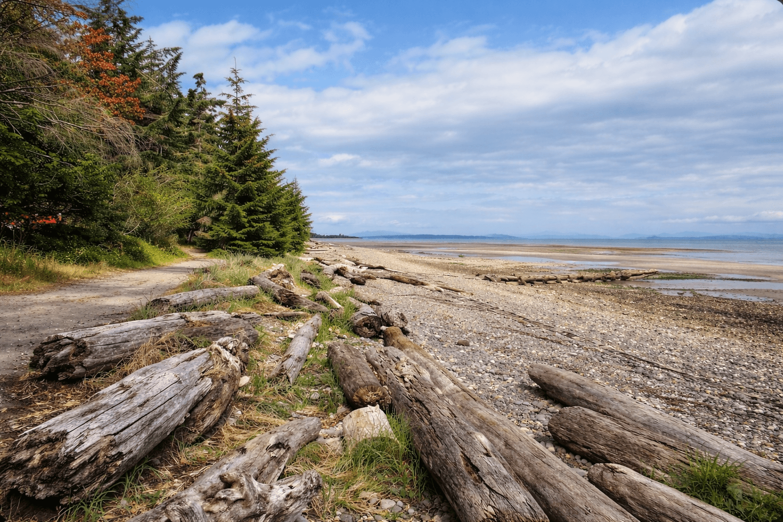 Black Creek sits just minutes from one of the most unique and accessible coastlines in the Comox Valley, with Saratoga Beach being a defining feature of the area. At low tide, the ocean recedes dramatically, revealing wide stretches of firm, walkable sand that extend far into the Strait of Georgia. This creates a rare coastal environment where walking, swimming, and beachcombing become part of everyday life rather than occasional outings.