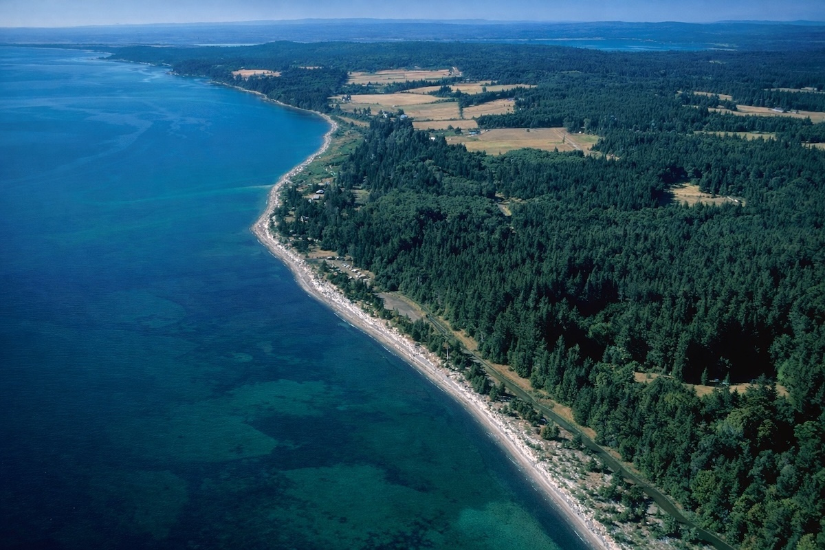 Fillongley Provincial Park anchors the east side of the island with a wide, gently sloping shoreline and mature coastal forest. At low tide, the beach stretches dramatically, revealing sandbars and tidal patterns across Baynes Sound. It’s one of the most accessible and consistently beautiful stretches of coastline in the region.